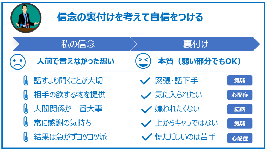 下の左側が信念で右側が裏付け(心の声)になるので参考にして下さい。