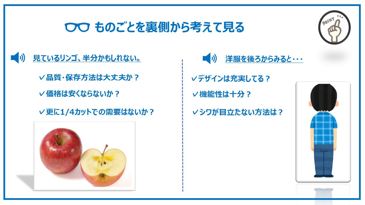 視点を真逆にしてみると相手も気付かない発想が出て感謝されます。